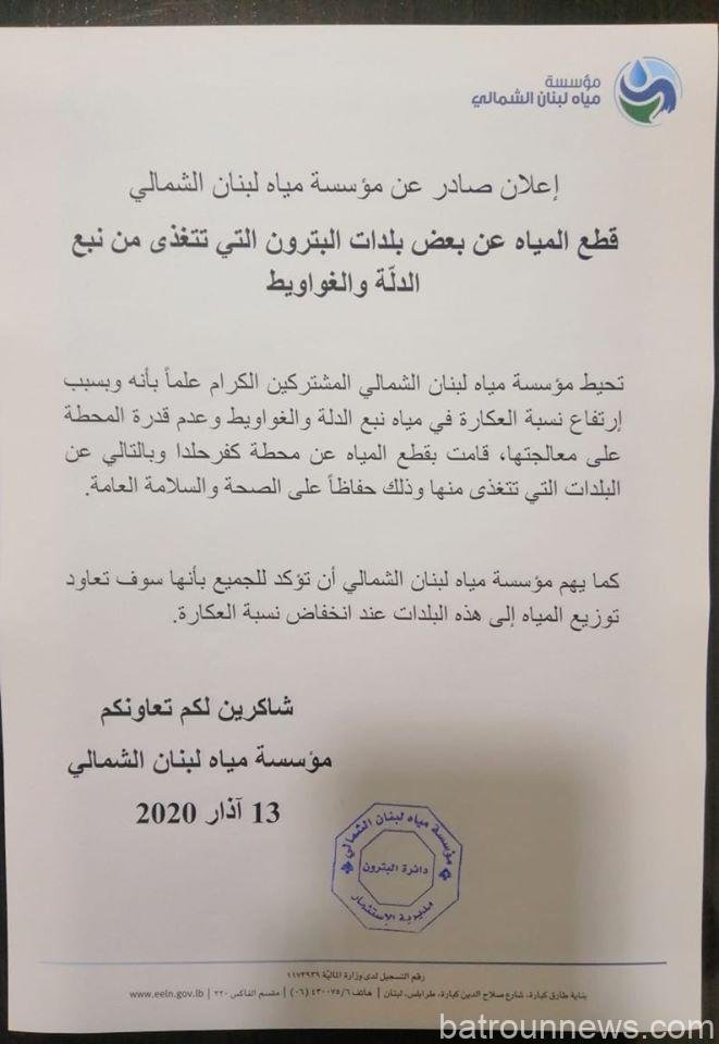 قطع المياه عن بعض بلدات البترون