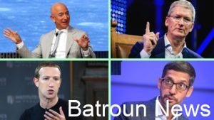 أصحاب شركات التقنية العملاقة أبل، وأمازون، وفيسبوك، وغوغل يواجهون مزاعم باتباع سياسات احتكارية Getty Imagesرئيس فيسبوك مارك زوكربيرغ، ورئيس أمازون جيف بيزوس، والمدير التنفيذي لـغوغل ساندر بيتشاي، ورئيس شركة أبل تيم كوك...