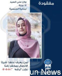 تعميم صورة القاصر المفقودة روان علي السّيّد صـدر عـن المديريـة العامة لقوى الأمن الداخلي ـ شعبة العلاقـات العامـة البـلاغ التالــي: تعمم المديرية العامة لقوى الأمن الداخلي،...