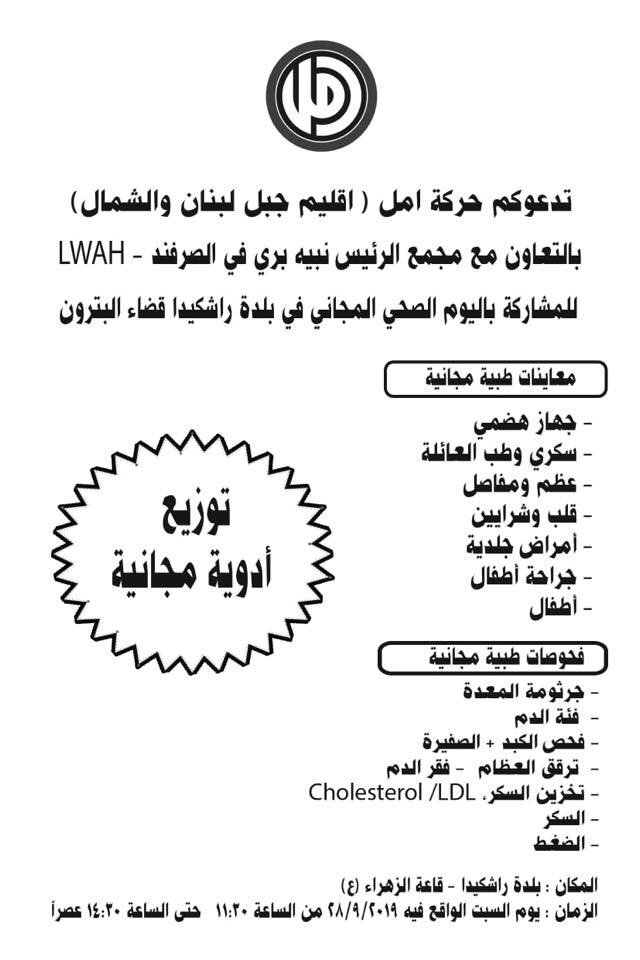 يوم صحي مجاني في رشكيدا بدعوة من حركة أمل تدعوكم حركة امل اقليم جبل لبنان والشمال وبالتعاون مع مجمع الرئيس نبيه بري الصرفندlwAH للمشاركة في باليوم الصحي المجاني...