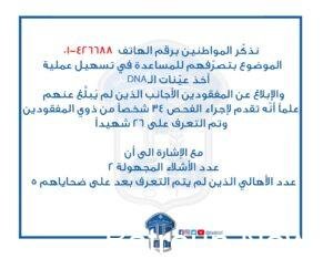 قوى الامن: التعرف على 26 شهيداً نتيجة فحوص ال dna، وعدد من الأشلاء المجهولة قوى الامن: تم التعرف على 26 شهيداً نتيجة فحوص ال dna، عدد الأشلاء المجهولة هو 2، و 5 عائلات...